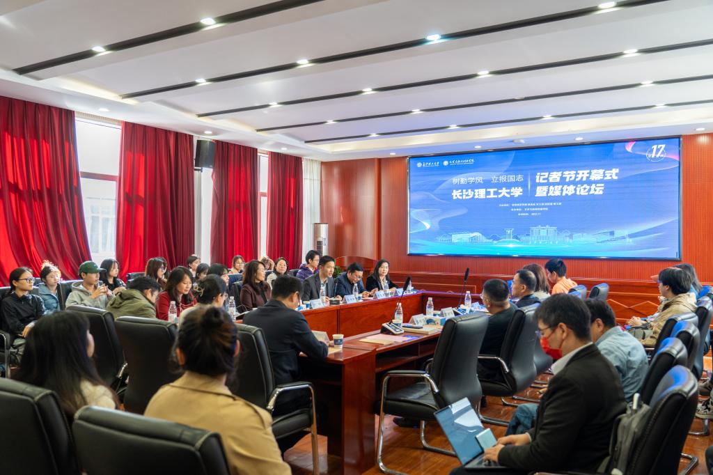 11月4日14时30分,我校于金盆岭校区九教218学术报告厅举行第十七届记者节开幕式暨媒体论坛。校党委副书记方琼、湖南广播电视台新闻中心副总监高金华、芒果超媒副总编辑易柯明、湖南日报社时政频道副总监,湘伴工作室主任邓晶琎、校党委宣传部副部长涂道勇,文新学院全体院领导和师生代表齐聚一堂,共同研讨数媒时代新闻人才培养的创新路径。