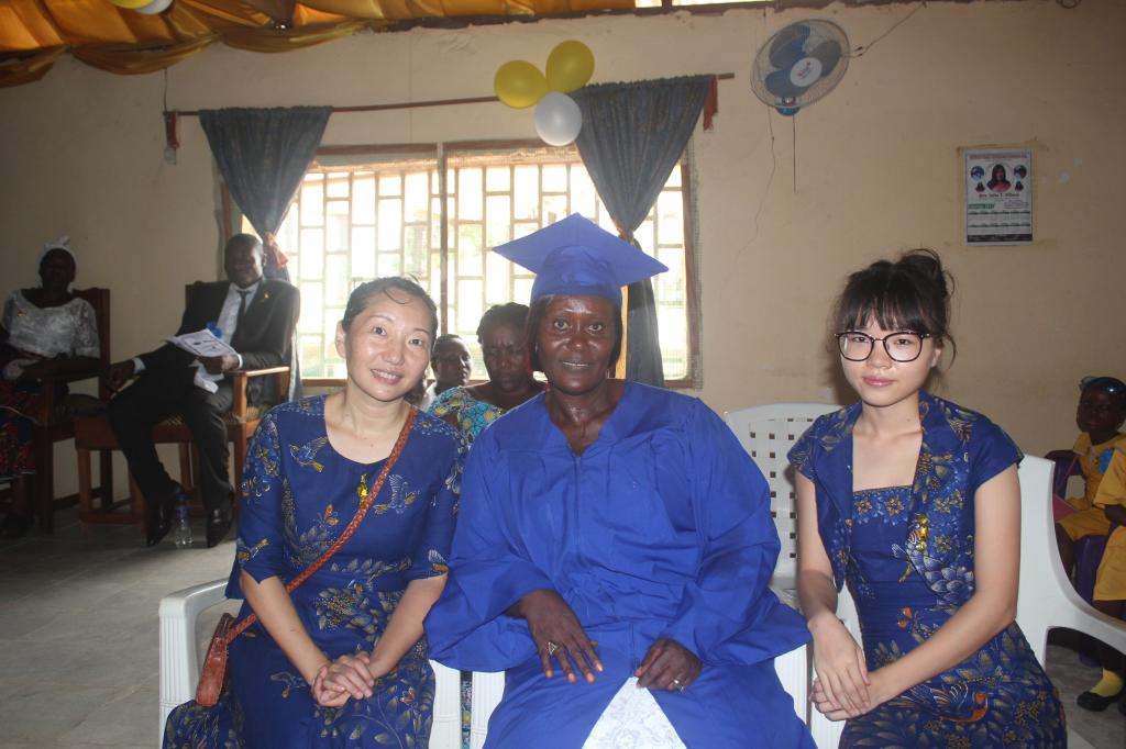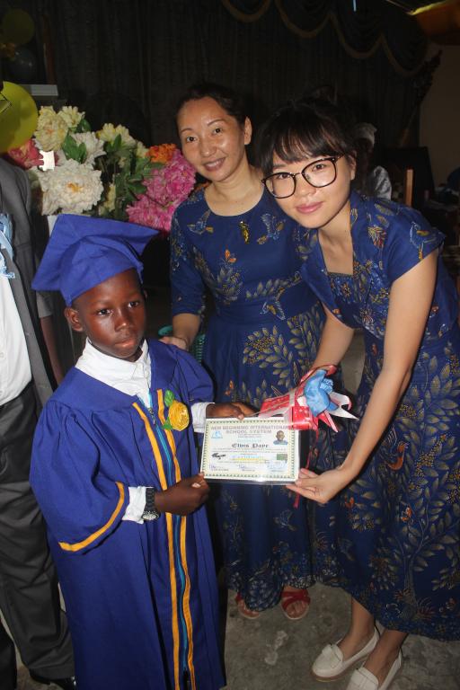 到了给毕业生颁发毕业证书的环节,贺润东老师和熊宇仙老师一一把证书递到孩子们的手中,并向他们表示祝贺。贺润东老师在发言中说,希望看到他们每一个人都能从小学到初中,到高中,再到大学,一直读下去,并争取能去中国留学。她强调了教育的重要性,认为教育是利比里亚发展的关键。她鼓励孩子们努力学习,希望他们像海绵一样,不停地吸收知识。孩子们是利比里亚的未来,只要他们努力学习,将来一定能成为栋梁之材,为利比里亚贡献自己的力量,把利比里亚建设得繁荣富强。