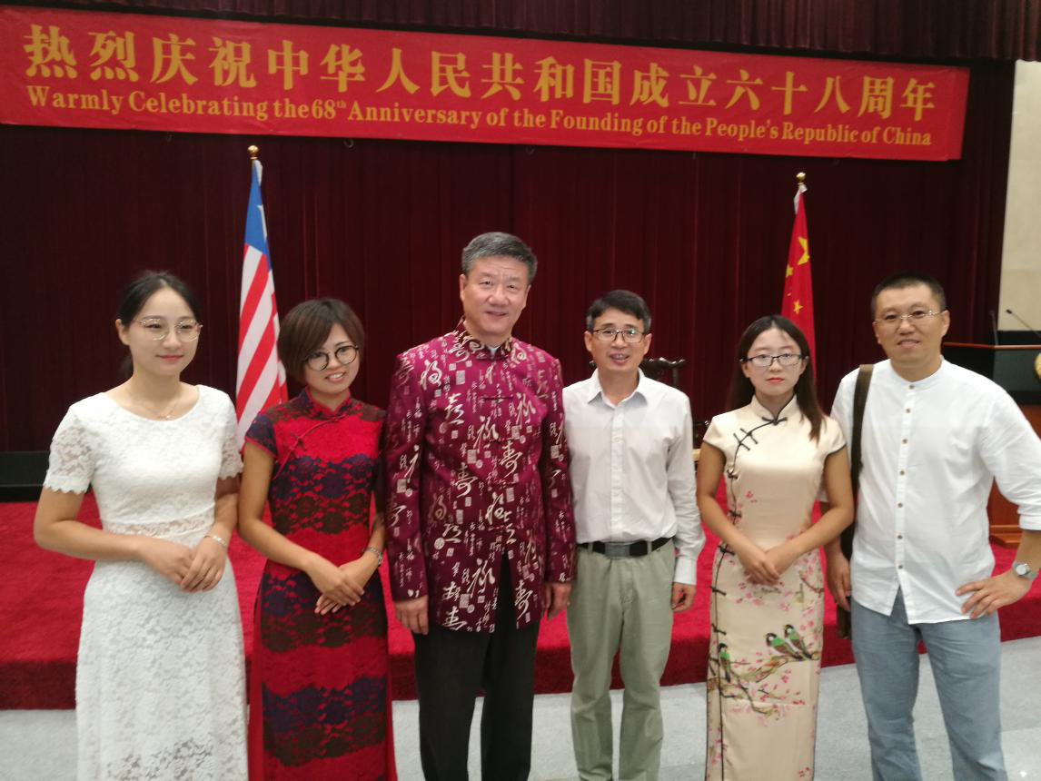 当地时间9月13日,利大孔院全体教师参加了中国驻利大使馆隆重举办“庆祝中华人民共和国成立六十八周年”国庆招待会。中国驻利大使张越、利比里亚总统瑟利夫(Ellen Johnson Sirleaf)、中国驻利参赞、武官、利政府各部门部长出席了招待会。孔子学院教师和其他援利机构、中资企业代表,华人华侨代表应邀出席。
