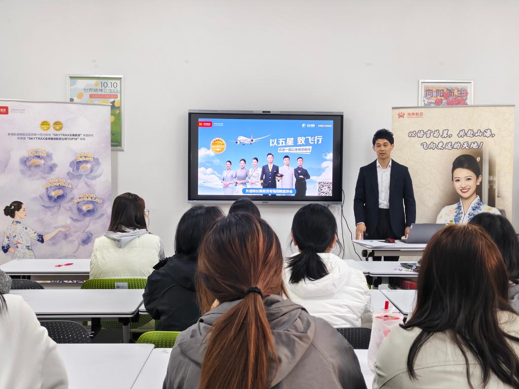 宣讲中,马祥文详细介绍了方大集团的企业理念与海南航空的发展优势,重点解读了外语特长乘务员的岗位特色、职业通道及“孝敬父母金”等专属福利,让同学们对企业实力与岗位前景有了清晰认知。