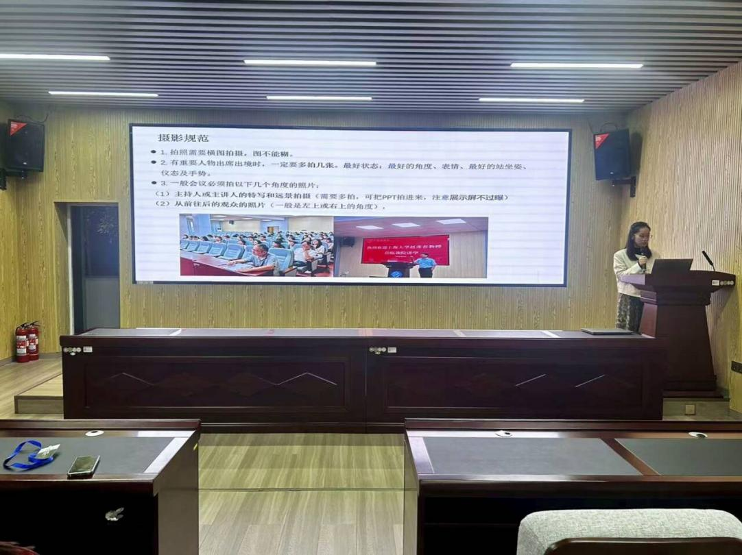培训过程中,各部门部长分别就各自分管工作领域进行了系统讲解。办公室郭子婷重点讲解了各类文件的制作规范和考勤管理的全流程规范;学研部曾媛媛分享了查课工作的实施要点和学术讲座设备调试方面的准备工作;生权部邓楚阳强调了查寝评优工作的注意事项;文体部张旭姝通过现场演示,生动讲解了会务礼仪规范;组织部宋柳柳系统介绍了辩论赛的组织流程与赛制规则;宣传部左芷睿则围绕微信公众号推文制作与摄影技巧进行了专业指导。各位部长的讲解既注重理论指导,又结合工作实际,使培训内容更具针对性和实用性。最后,培训还进行了229报告厅设备使用的实操教学,为后续活动的顺利开展提供了有利保障。