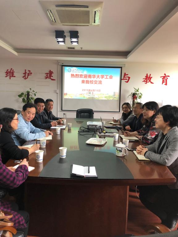 4月16日下午午,南华大学工会常务副主席柯国军、副主席吴成丰一行来我校工会交流,校工会常务副主席曹瑛、副主席郭湘洪、赵爱群等同志参加工会工作交流会。