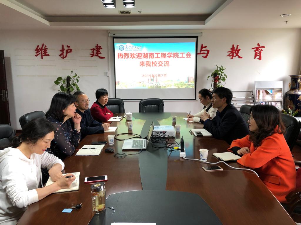 5月7日下午,湖南工程学院工会常务副主席文龙光、副主席贾珍一行来我校工会交流,校工会常务副主席曹瑛、副主席郭湘洪等同志参加工会工作交流会。