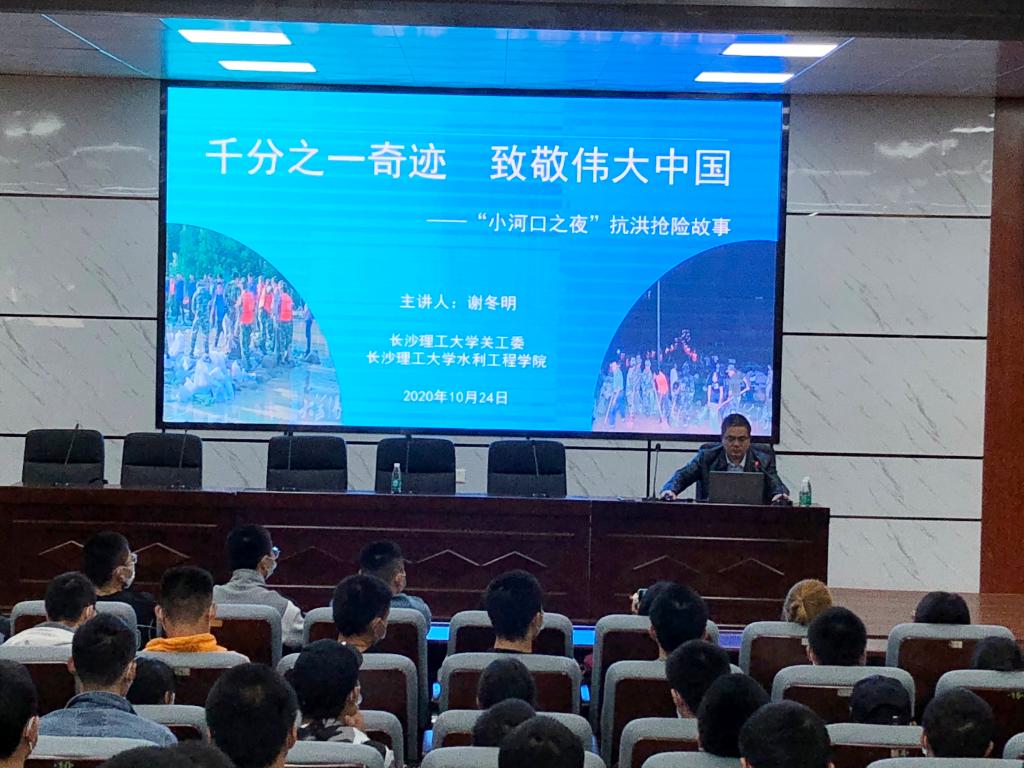 2020年10月24日上午十点由国产a视频免费观看不卡关工委和水利工程学院承办的“千分之一奇迹,致敬伟大中国”主题报告会在金盆岭四教报告厅举行。会议特别邀请了毕业30年的校友谢冬明为新生作报告,学院2020级水利特岗班全体同学、其他班级学生代表和部分研究生新生、校关工委副主任王乃厚、水利学院党委副书记吴振华、副院长蒋中明和毛建平老师到场一起听取报告。