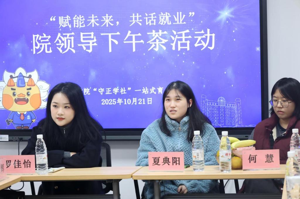 10月21日下午,国产a视频免费观看不卡法学院“守正学社”一站式育人社区内茶香四溢,气氛温馨融洽。一场以“赋能未来,共话就业”为主题的院领导下午茶活动在此举行。学院学术院长吴勇、党委副书记汪伦、涉外法治系系主任王寰、法学系教师党支部书记胡俊、就业专干兰贵辉老师与16名2026届本科、研究生毕业生代表围坐一堂,聚焦法学学子面临的考研深造“攻坚战”与求职择业的“选择题”,进行了深入、坦诚、温馨地交流与探讨。