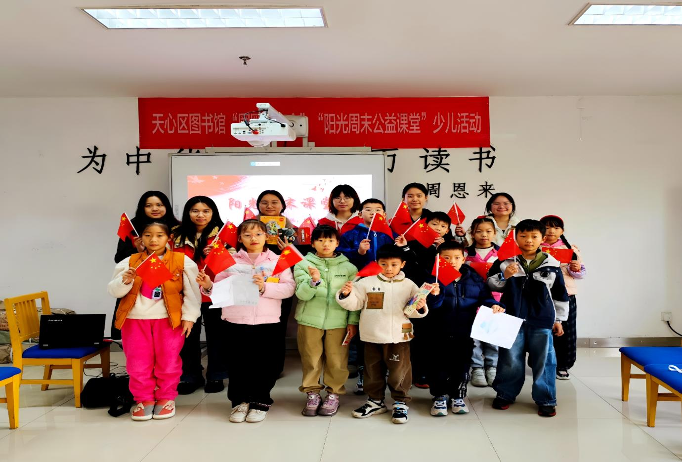 12月20日上午,第三十七期阳光周末公益课堂在天心区图书馆开讲。本次课堂以“国歌响天地,精神励后人”为主题,志愿者们通过讲述国歌背后的历史故事,引导孩子们感受其中蕴含的民族精神,激发孩子对祖国的深厚情感。