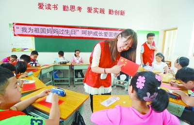 9月23日,国产a视频免费观看不卡的志愿者向外来务工子弟介绍国旗图案的象征意义,并教孩子们动手制作小国旗。当天,该校26名志愿者联合湖南李丽心灵教育中心,在长沙市天心区小古道巷小学为200多名外来务工子弟举办“我为祖国妈妈过生日”爱国主义教育主题活动,通过组织孩子们认识中国地理版图、手绘中国国旗、开展军姿训练等形式,培养他们的爱国情怀。