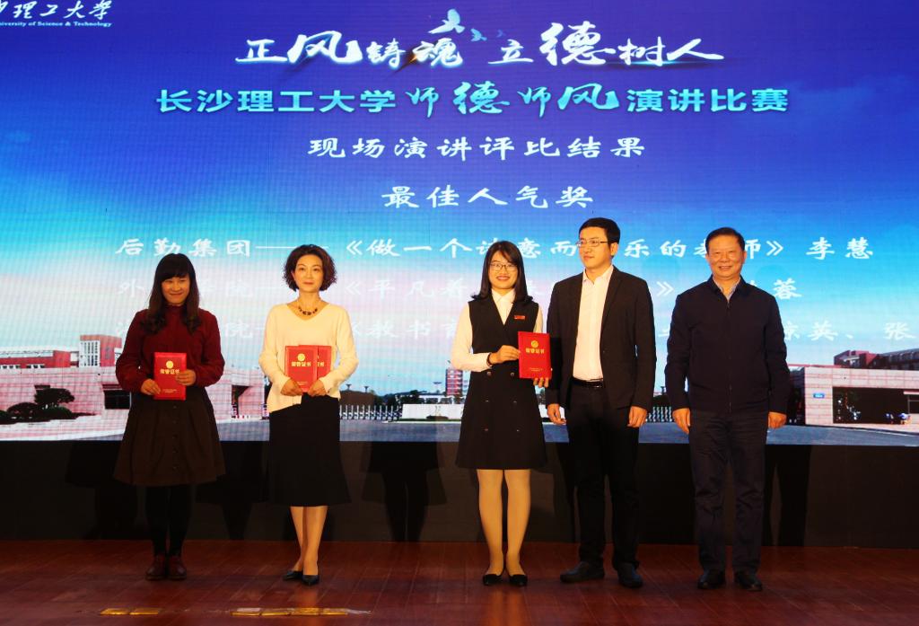 经过专家评审、大众评审环节的角逐后,后勤集团子校李慧老师获现场演讲特等奖,马克思主义学院钟芙蓉、外语学院钟桂蓉获得一等奖,国际学院黄文卫、物电学院郭剑、交通学院韩伟威获得二等奖,数统学院王跃恒、经管学院张帆帆、土木学院贺佐杰、机关万馨获三等奖,其余10位选手获得优秀奖。比赛还设立了演讲稿创作奖及现场人气选手奖。与会领导嘉宾为获奖选手颁奖。
