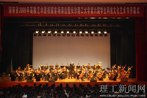 4月7号晚,月色如潮,万籁和谐,云塘校区弥漫在优美的旋律中。湖南省2009年高雅艺术进校园首场演出暨我校第六届学生科技文化艺术节开幕式在大会堂隆重举行。我校党委书记王耀中、副校长黎正稳,省教育厅体育卫生工作处副处长文麦秋、办公室主任刘大维,我校党政办、宣传部、学生工作部(处)、校团委等部门负责人、各学院党委副书记及学生代表1600多人观看了演出。