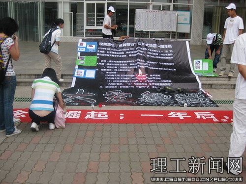 在5·12汶川地震一周年到来之际,化学与生物工程学院食品0802班学生们也用自己的方式为灾区人民祈福。5月12日这天,同学们早早起床,身穿纯白色的班服,进行活动的各项准备工作。他们精心准备了“祈福墙”、签名横幅,购置了签字笔、便签纸、黄丝带,搬来了长条桌和音响设备。中午12:00,活动在学校汀香园食堂门口准时开始,经过的不少老师和学生纷纷停下脚步,主动过来用笔墨写下心底的祈愿,然后统一粘贴在“祈福墙”上,表达着对灾区罹难者美好的祝愿。
