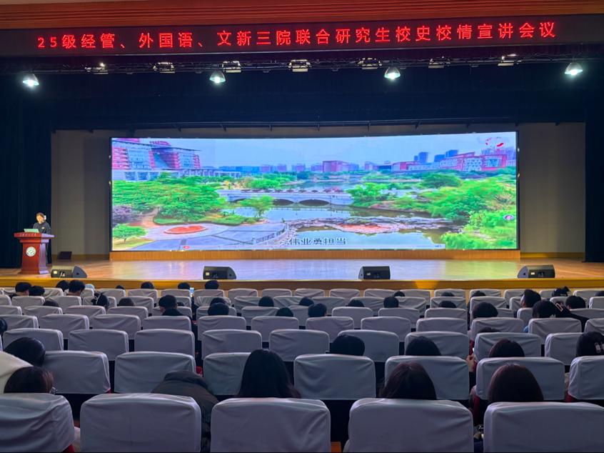 为帮助2025级研究生新生深入了解学校发展历程,增强对学校的认同感和归属感,11月4日晚,文新学院、经管学院、外国学院于金盆岭校区五教大礼堂联合举办校史校情专题讲座。全体研究生新生参加本次活动,讲座由我校研究生宣讲团成员主讲。