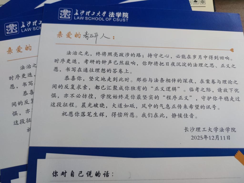本次活动既传递了学院对考研学子的深切关爱,也为冲刺阶段的学子提供了考前指导,有效凝聚了奋进力量、提振了备考士气,愿全体考研学子在法途路上步履坚定、折桂研途。
