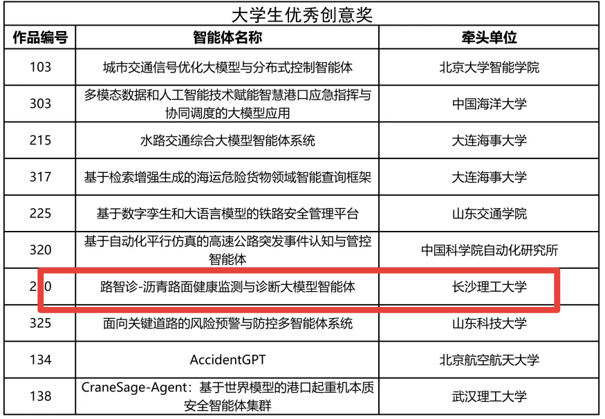 12月9日至10日,由交通运输部科技司等单位指导的领域权威赛事“第一届综合交通运输大模型智能体创新应用大赛全国总决赛”在厦门举行,经过激烈角逐,由我校交通学院吕松涛教授团队报送的作品《路智诊-沥青路面健康监测与诊断大模型智能体》最终荣获“大学生最佳创意奖”。