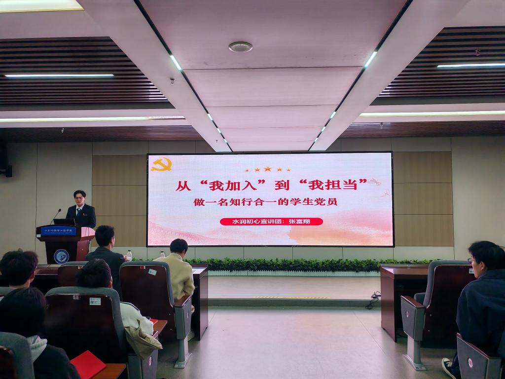 会议坚持问题导向,崔俊雄等针对近期的不足,进行了陈述和汇报,直面问题,深刻剖析问题根源并提出整改措施。“水润初心”宣讲团成员张富翔以《从“我加入”到“我担当”——做一名知行合一的学生党员》为主题进行宣讲,他从现象入手,梳理了学生党员队伍易出现的理论学习主动性不强、担当意识不足等现象,分析了问题产生的原因,并结合优秀党员事迹分享、党员的义务等,号召全体党员强化理论武装、加强党性锻炼、切实发挥先锋模范作用。为明确行为规范,学生党总支委员李晨浩领学了《水利与海洋工程学院学生党员日常管理细则》,对其核心要求进行解读,为党员日常言行提供清晰标尺。