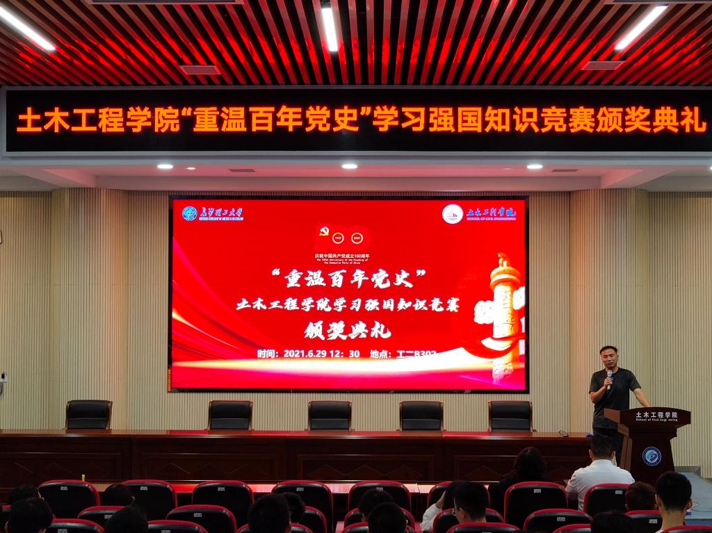 “没有共产党就没有新中国,没有共产党就没有新中国,共产党,辛劳为民族,共产党他一心救中国,他指明了人民解放的道路,他领导中国走向光明……”在土木工程学院“学习强国”知识竞赛颁奖典礼现场,全场师生齐声高唱《没有共产党就没有新中国》,用歌声向建党100周年献礼。院党委书记江河,党委副书记黄阿明,学生党总支副书记胡蓉院、院团委书记董治佑参加,院学生党总支副书记李小军主持典礼。