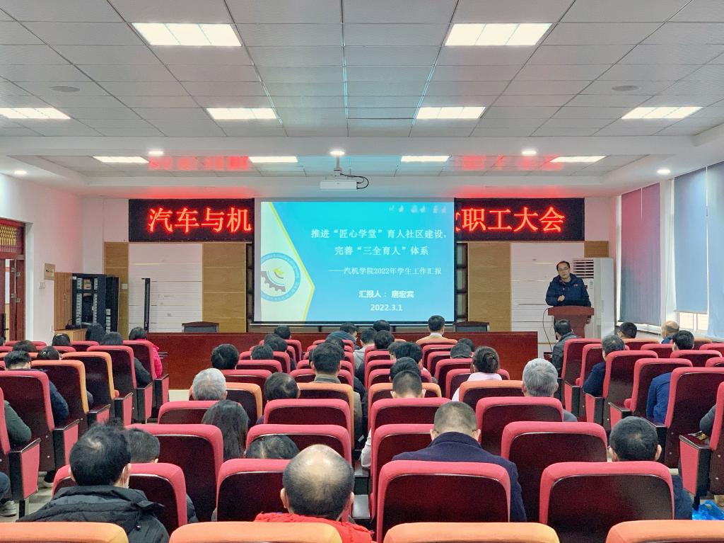 院长杜荣华针对学院目前面临的新形势、新任务、新挑战,从“全面从严治党,以高质量的党建引领学院高质量发展、推进‘双主体’协调发展,落实立德树人根本任务、加强学科内涵建设,提升学院核心竞争力、推进‘匠心学堂’育人社区建设,完善‘三全育人’体系”四个方面,解读了《汽车与机械工程学院2022年工作要点》,提出了学院2022年度工作目标任务,并对重点工作作了进一步了阐释。