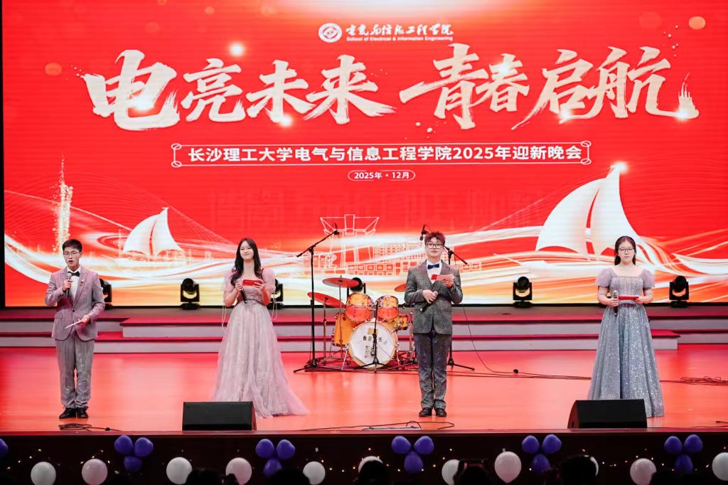 12月25日晚,“电亮未来,青春启航”电气与信息工程学院2025年迎新晚会在云塘校区大礼堂举行。校党委委员、副校长张军辉出席并讲话,湖南科比特集团董事长郭贵雄、总裁刘庆文、副总裁彭宇,北京双杰电气有限公司副总裁许专、副总经理曾艳等校友代表,学校教育基金会秘书长肖辉,学院党委书记丁丹等在家院领导,电网防灾减灾全国重点实验室顾问符慧林,2025级新生班主任代表及2025级1089名新生参加。