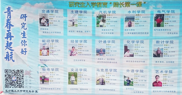 在学业规划方面,外国语学院的柳晓辉副院长讲授了主题为《志存高远,弘外院荣华》的新学年第一课,指出国家推出的“一带一路”倡议正需要大量精通英语及小语种的人才。英语专业的学生应该学贯中西,树立远大理想,抓住机遇,为中国文化“走出去”做贡献;经济与管理学院院长陈银娥以《如何读研究生》为题分析研究生和本科生的区别,还为研究生新生提出了四点建议:“保持良好的心态”、“充分利用各种学术资源”、“预先经营未来”、“尽快适应环境”;计算机与通信工程学院的张建明副院长以《“互联网+”给计算机学科带来的机遇与挑战》为题,道明了在“互联网+”的社会环境下,研究生应制定更加长远的学业规划,掌握专业知识,号召研究生以研究学术为职业而努力学习。此外还有交通学院,土建学院,电气学院,数计学院,化学学院,能动力学院,马克思学院以学业规划为主题进行“院长第一课”的研究生入学教育,为新生在研究生阶段明确目标,科学规划起到了启发作用。