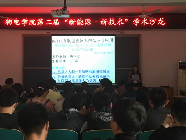 王磊是一位工作八年后再回学校读研的学生,源于对机器人的钟爱和科技强国的情怀,他在2014年9月注册成立赛伯睿机器人技术(长沙)有限公司。他汇报的题目是《Delta并联型机器人产品及其应用》。他主要介绍了机器人产品的发展历程和在提高生产力方面的应用,同时对自己设计的机器人产品和应用做了阐述,通过视频展示极大地提高了观众们的兴趣。接着,刘娟汇报的题目是《化学修饰对低维纳米材料输运性能与电磁特性的调控》,她主要介绍了课题的研究背景、意义和方法,并通过研究得出结论过渡金属Fe、Co、Ni、Ti等元素的边缘钝化,使单层氮化硼纳米带既保持了磁性,又拥有了较好的稳定性。随后,郑健汇报的题目是《镍离子掺杂透明微晶玻璃的制备及光学性能研究》,他在汇报中提出了通过镍离子掺杂,可得到低温、高透明、良好荧光效应的微晶玻璃,并对其光学性能和应用前景进行了详细的分析。每位主讲人汇报完之后,相关专业老师分别作了精彩点评,现场气氛活跃,达到了很好的效果。