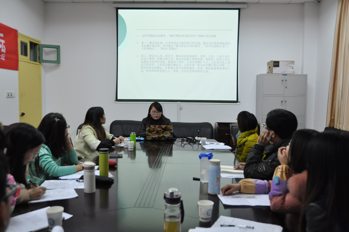 2013级科学社会主义与国际共产主义专业的吕晓倩研讨的主题是《中国梦背景下的农民政治心理》。她所展示的论文分为新时期农民政治心理的影响因素,中国梦对农民政治心理的作用,中国梦提出后农民政治心理上的新期待,新时期优化农民政治心理的路径选择这四部分。随后,2014级研究生陈金彪,谢亚,丁予聆,詹林情,周帅,闵泽琼等进行了提问和交流,李雨燕与易显飞进行了精彩点评,易显飞老师指出了学院开展研究生学术沙龙的重要意义,并对以后的学术沙龙活动组织形式、管理机制、考核方式、活动效果等提出了更严格的要求。2013级科学社会主义与国际共产主义专业的李燕就论文《党的十八大以来群众路线研究:一个文献综述》与大家分享了她的一些科研经验。李雨燕老师先组织大家对文献综述的写法、民主与群众路线的区别进行了讨论。2014级研究生陈琛,陈金彪,吴杨梅,周帅等对此问题进行了热烈的讨论。最后李雨燕老师对民主与群众路线做了明晰的解释并总结了关于文献综述的写法。
