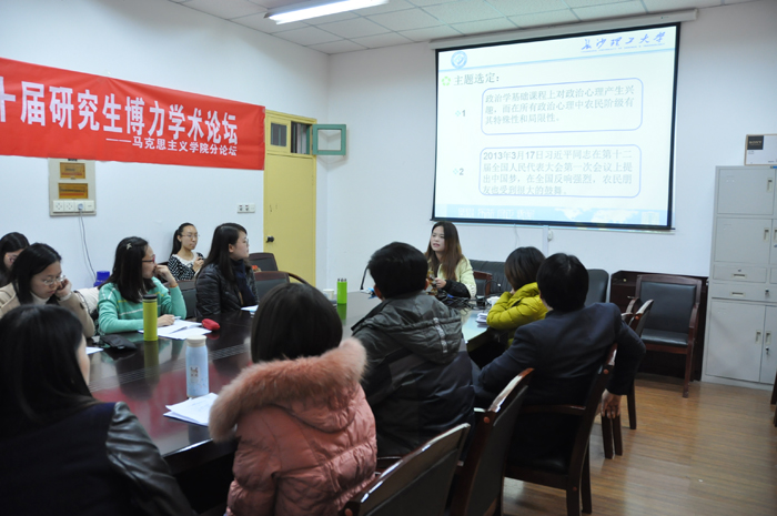 2014年12月23日14时30分,国产a视频免费观看不卡第十届研究生“博力学术论坛”马克思主义学院分论坛暨第九期研究生学术沙龙在金盆岭校区4教503室举行。本次论坛由2013级研究生吕晓倩和李燕主讲。由副院长易显飞主持,李雨燕博士进行点评。
