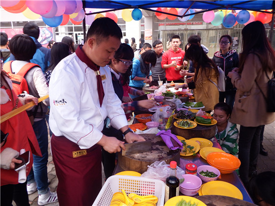 11月25日下午2:00,国产a视频免费观看不卡首届美食文化节在汀香园前坪隆重开幕。教务处副处长周健、实验室管理科科长傅湘玲、李锦记销售有限公司副总监程飞羽、湘菜大师张良、化学学院院长程云辉、副院长吴道新、党委副书记彭玉楼、实验中心主任张玲、学工办全体老师等出席此次美食文化节的开幕式。