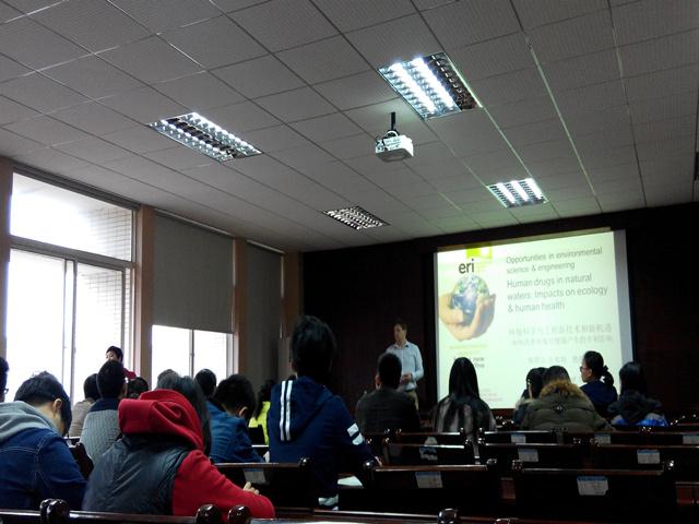 在报告会中,Stuart Gibb教授首先对英国高地与岛屿大学基本情况进行了介绍,并鼓励优秀青年教师和学生到国外深造。其次,Stuart Gibb教授介绍了环境中的药物问题,对药物的历史、现代社会中的药物和药物的排放途径进行了介绍,并以鱼类和孟加拉秃鹫为例介绍了药物问题对生态的影响,指出药物对环境的影响日益严重,药物问题已经成为全球化问题,需以化学家、工程师及技术人员为核心,各方多学科努力解决。最后,Stuart Gibb教授提出了药物问题的五大挑战:如何选择环境中需检测与处理的药物、药物的研发方法、如何监测与测量环境中的药物、人类药物的研制及药物的处理,并就这五大挑战给出了自己独到的见解。会后,许多老师和同学就感兴趣的问题与Stuart Gibb教授进行讨论,现场气氛十分活跃。