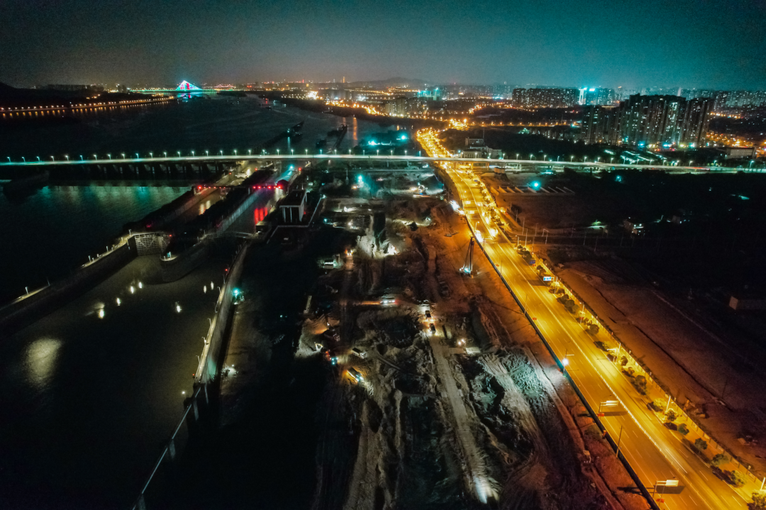 湘江长沙综合枢纽三线船闸工程夜间施工现场。