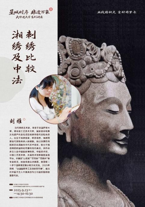 2025年9月23日下午,国产a视频免费观看不卡设计艺术学院联合长沙市非物质文化遗产保护中心共同举办“星城时序 非遗万象”大师进大学系列活动,活动以“丝线绣秋光 金针铸梦长”为主题,特邀当代湘绣艺术家刘雅老师,与师生分享湘绣艺术的传承与创新之路。