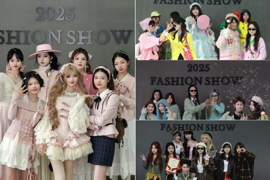 作为《设计心理学》课程教学成果的创新转化,学生们打破传统“纸上谈兵”的作业模式,既将设计心理学理论解构为可视化的时装语言,更融入艺术疗愈的温柔力量,把课堂作业搬上T台,完成了从书本到秀场、从理论到心灵共鸣的华丽蜕变。伴随着律动的节奏,15组时装系列如同流动的画卷依次展开,带来一场直击感官的视觉洗礼。“粉红女郎”以色彩诠释女性的自信姿态;“美拉德”系在光影流转间尽显高级质感;“多巴胺”用高饱和度色彩瞬间点燃现场活力;而“克莱因蓝”与粉色相互对冲又奇妙共生。从Y2K的未来幻想穿越至“静奢风”的现实极简,从暗黑风的冷峻锋芒到“薄荷曼波”的清新治愈,研究生设计师们将烘焙美学的温情、自然意象的生机与数码元素的科技感巧妙解构重组,每一套作品不仅是视觉的盛宴,更是新生代设计师用时装书写的青春独白。