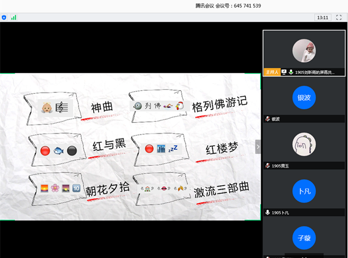 此次线上读书分享会分为“好书推荐”、“爱书感言”、“我与书的那些事”三个环节,同学们将自己最喜欢的一本书在交流框逐一推荐并附上荐读理由,进一步丰富了自己的书库;6位参与代表作“爱书感言”分享,分别从书籍的背景、内容以及读后感想等多方面介绍,1905班孙文欣以诙谐的语调介绍了三毛的《撒哈拉的故事》,描述了一系列以沙漠为背景展开的奇妙有趣的故事,让人不禁对此书产生深深的好奇。1703班文雅琼带领同学们走进《青春之歌》,一起回顾中国豪迈沧桑的旧历史,了解那个时代进步青年的成长变化过程,她指出新时代青年应向书中积极投身革命建设的林道静一样,将个人理想融入国家民族的共同理想之中,以青春作画笔,唱响时代主旋律。分享环节中穿插了“猜书名”、“书名接龙”等互动环节,同学们踊跃参与其中,其读书的积累在互动中得到了很好的呈现,也让大家感受到书籍带来的力量与趣味。