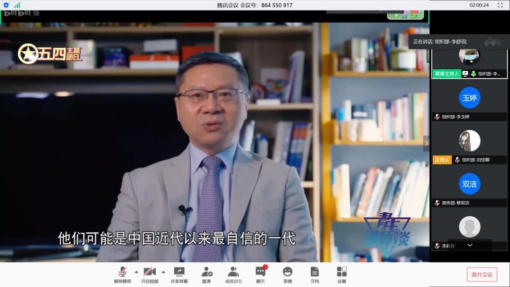 会议伊始,全体成员观看了“让青春为祖国绽放”直播的第一篇章出彩青春以及五四青年节特别团课,观看了各行业杰出青年代表的青春模样。随后,与会人员热议习近平总书记五四青年节寄语,唐青表示作为新时代新青年,要勇于发出自己内心的声音,在更深的层次上分享自己的所学所想,号召同学们积极学习五四精神,以五四精神为指引,培养高尚人格,为国家和社会做出应有的贡献。