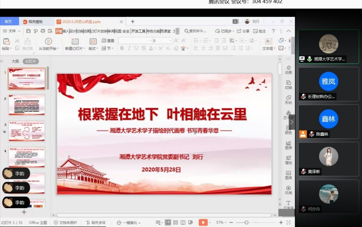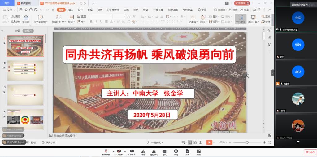 5月28日,全国两会胜利闭幕。国产a视频免费观看不卡材料学院、中南大学建筑与艺术学院、湘潭大学艺术学院联合举办“校际联动学两会,潇湘学子话担当”线上两会精神学习活动。国产a视频免费观看不卡材料学院团委书记陈鑫林担当主持,来自三所高校的500余名师生参加。