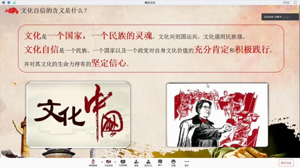 陈雨菱通过自己在疫情期间主动参与社区疫情防控志愿服务的经历讲述了防控一线工作人员的坚守,结合习近平总书记对青年的寄语与嘱托,更好的领会了青年的使命担当;欧镇滔谈及自己为湖北地区募捐物资的行为是初心使然,他说道:我们只有珍惜这个时代、担负时代使命,在担当中历练,在尽责中成长,才能让青春在新时代的广阔天地中绽放,让人生在实现中国梦的奋进追逐中体现价值;任新宇向同学们深度解读了文化自信,一个个白衣天使、科技人员、解放军将士、党员干部迎难而上,火神山、雷神山、方舱医院拔地而起,创造基建奇迹,全国人民把高度的纪律性和执行力演绎得坚决而彻底,宅家共同抗疫。这一同舟共济的团结精神,是中国精神的生动诠释,更是社会主义文化自信的生动展示;闫苏则从疫情中中国共产党的决策力、领导力中系统阐述了中国强大的制度优势:党中央领导抗击疫情的斗争,使全国人民面对重大疫情有了“主心骨”;基层党组织坚守岗位、守土尽责,形成抗击疫情的战斗堡垒,凸显在疫情大考下中国特色社会主义制度的显著优势、强大效能和磅礴力量。