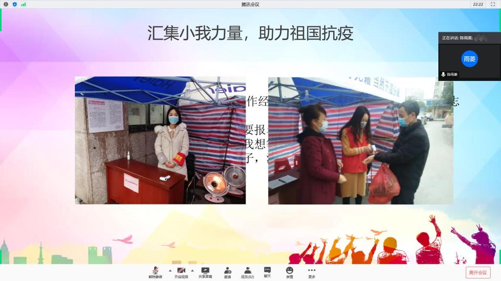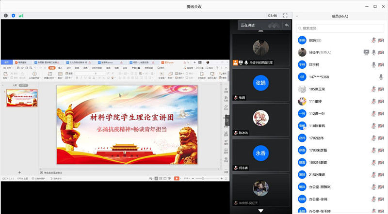6月2日晚,材料学院通过腾讯会议开展主题为“弘扬抗疫精神,畅谈青年使命”宣讲活动,由学生宣讲团成员陈雨菱、欧镇滔、任新宇、闫苏主讲,学院各班级代表、团学会成员以及入党积极分子共计100余人参与。