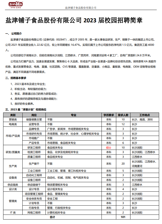 盐津铺子食品股份有限公司2023届校园招聘简章