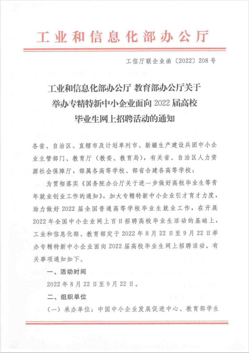 教育局办公厅关于举办专精特新中小企业面向2022届高校毕业生网上招聘活动的通知