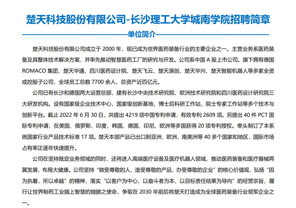楚天科技股份有限公司招聘简章