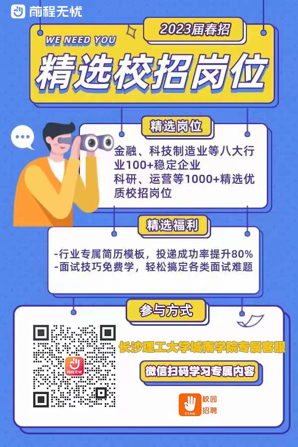 本次活动前程无忧利用自身平台优势、企业资源、就业策划指导团队,为大家提供定制化的就业辅助指导,提高学生简历制作水平、行业选择敏感度、岗位匹配精准度、面试熟练度和技巧性,同时增加广大毕业生获得优质offer的机会。