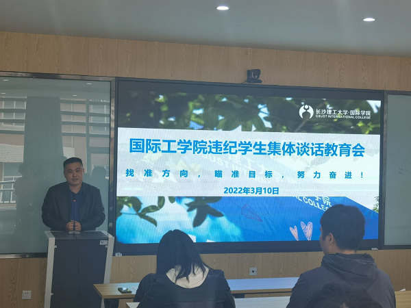 3月10日中午,为加强学风建设,严明校纪校规,国际工学院在新能源大楼1栋404室召开违纪学生集体谈话教育会。国际工学院院长吴迪龙、院党总支副书记兼副院长乔法光出席本次会议,院学工办全体辅导员和30余名违纪学生参会。会议由唐宏敏主持。