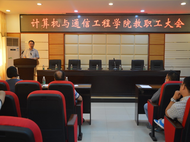 9 8 下午,计算机与通信工程学院在理科楼B311召开全院教职工关于“贯彻落实学校第三届党代会精神”宣讲大会,会议由学院院长李峰主持,副校长黄立宏做重要讲话,计通学院党委书记方琼、党委副书记王任飞、副院长李平、副院长王威、副院长张建明及全院教职工出席会议。