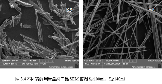 由图3.2可以看出,本体系制得的硫酸钙晶须表面光滑,结晶度较好。低浓度硫酸制得的晶须产品长径比更大且末端更光滑。样品S1S2S4长径比分别为55.5633.3335.71