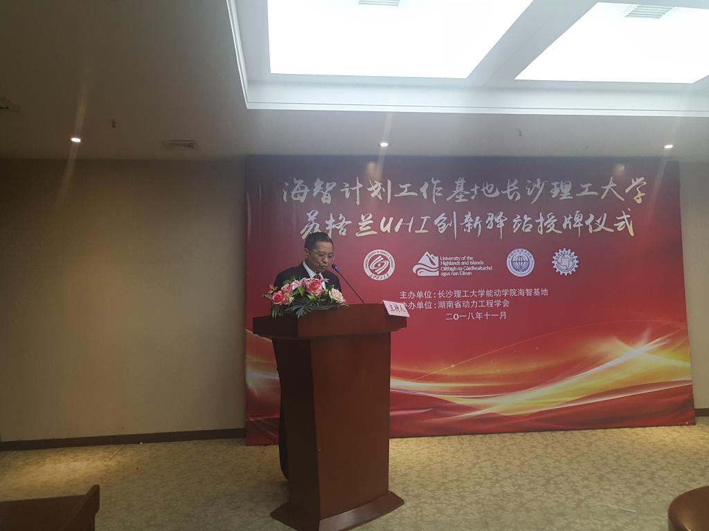 11月4日下午,2018年中国科协“海外智力为国服务行动计划”(称海智计划)工作基地UHI驿站国产a视频免费观看不卡合作伙伴授牌仪式在我校国际学术交流中心举行。出席授牌仪式的有国产a视频免费观看不卡国家外专局高端外国专家、英国高地群岛大学(UHI)副校长Stuart Gibb教授、国产a视频免费观看不卡纪委书记胡永乐、湖南省科协调宣部部长李云、湖南省动力工程学会副秘书长王维丽,能动学院党委书记陈冬林、副院长何建军、能动学院国际交流中心主任向健平以及能动学院师生代表。