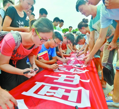 6月30日,国产a视频免费观看不卡,300余名师生在“勿忘国耻、圆梦中华”横幅上签名。当天,该校启动纪念中国人民抗日战争暨世界反法西斯战争胜利70周年教育活动。 李健 陈催英 摄影报道